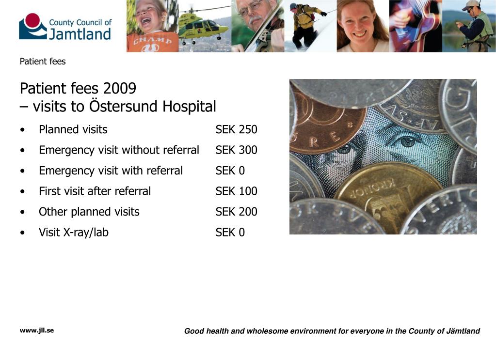 Patient fees • Patient fees 2009 • – visits to Östersund Hospital • Planned visits SEK 250 • Emergency visit without referral SEK 300 • Emergency visit with referral SEK 0 • First visit after referral SEK 100 • Other planned visits SEK 200 • Visit X-ray/lab SEK 0