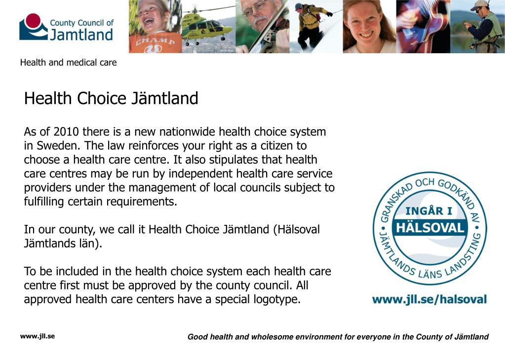 Health and medical care Health Choice Jämtland As of 2010 there is a new nationwide health choice system in Sweden. The law reinforces your right as a citizen to choose a health care centre. It also stipulates that health care centres may be run by independent health care service providers under the management of local councils subject to fulfilling certain requirements. In our county, we call it Health Choice Jämtland (Hälsoval Jämtlands län). To be included in the healthchoice system eachhealthcarecentre first must be approved by the countycouncil. All approvedhealthcare centers have a special logotype.