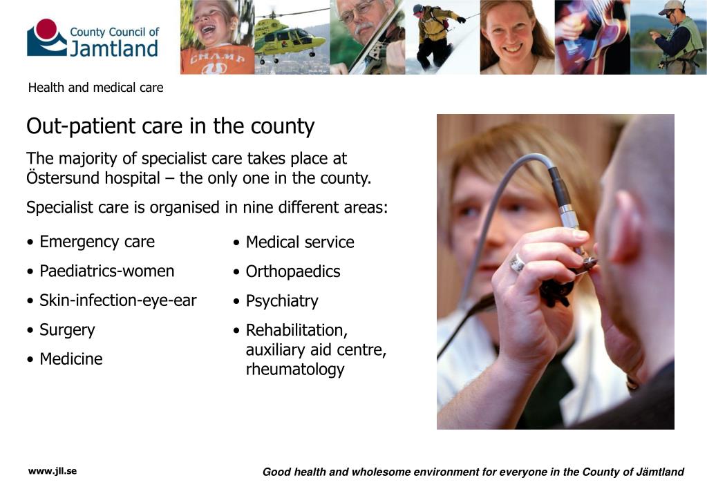 Health and medical care Out-patient care in the county The majority of specialist care takes place at Östersund hospital – the only one in the county. Specialist care is organised in nine different areas: • Emergency care • Paediatrics-women • Skin-infection-eye-ear • Surgery • Medicine • Medical service • Orthopaedics • Psychiatry • Rehabilitation, auxiliary aid centre, rheumatology