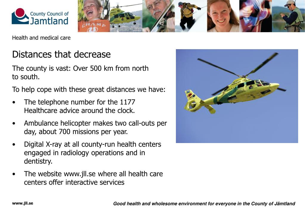 Health and medical care • Distances that decrease • The county is vast: Over 500 km from north • to south. • To help cope with these great distances we have: • The telephone number for the 1177 Healthcare advice around the clock. • Ambulance helicopter makes two call-outs per day, about 700 missions per year. • Digital X-ray at all county-run health centers engaged in radiology operations and in dentistry. • The website www.jll.se where all health care centers offer interactive services