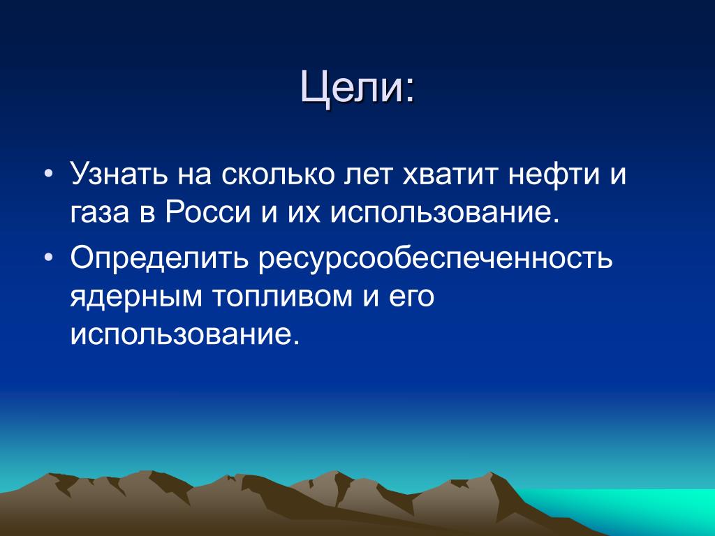 Цели: • Узнать на сколько лет хватит нефти и газа в Росси и их использование. • Определить ресурсообеспеченность ядерным топливом и его использование.
