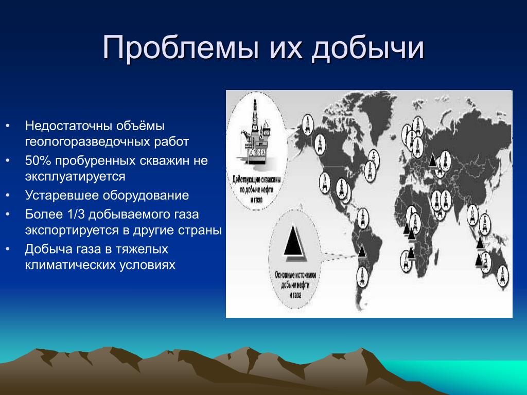 Проблемы их добычи • Недостаточны объёмы геологоразведочных работ • 50% пробуренных скважин не эксплуатируется • Устаревшее оборудование • Более 1/3 добываемого газа экспортируется в другие страны • Добыча газа в тяжелых климатических условиях