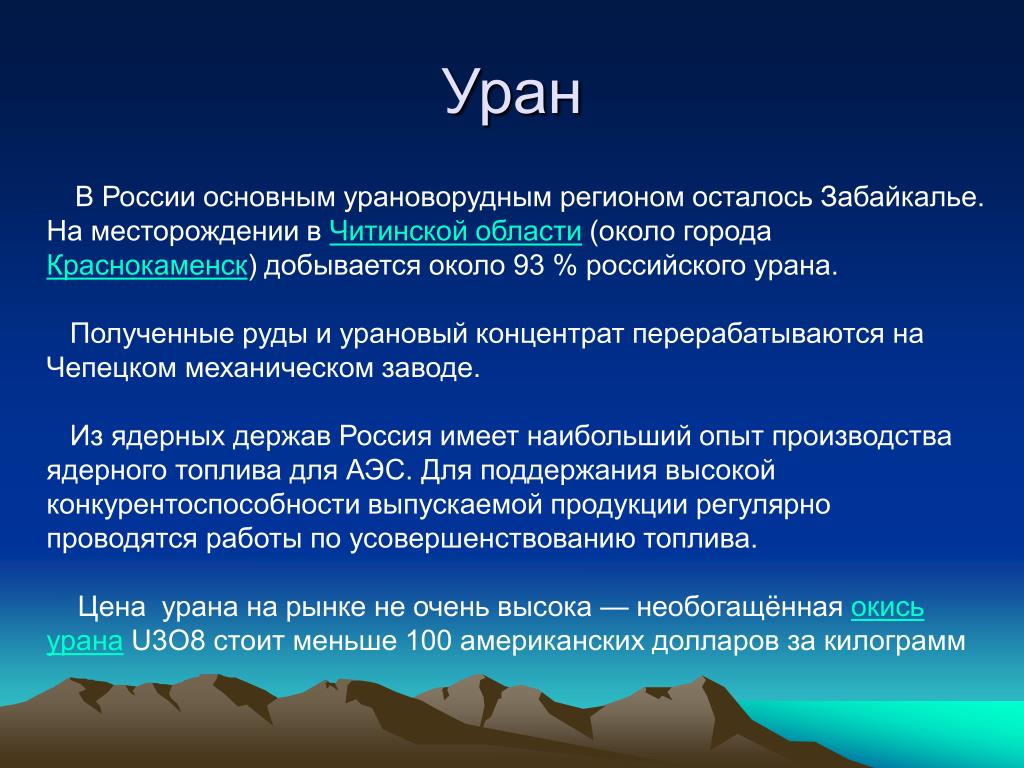 Уран В России основным урановорудным регионом осталось Забайкалье. На месторождении в Читинской области (около города Краснокаменск) добывается около 93 % российского урана. Полученные руды и урановый концентрат перерабатываются на Чепецком механическом заводе. Из ядерных держав Россия имеет наибольший опыт производства ядерного топлива для АЭС. Для поддержания высокой конкурентоспособности выпускаемой продукции регулярно проводятся работы по усовершенствованию топлива. Цена урана на рынке не очень высока — необогащённая окись урана U3O8 стоит меньше 100 американских долларов за килограмм