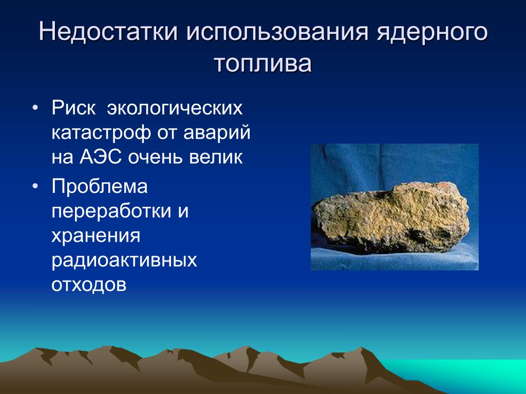 Недостатки использования ядерного топлива • Риск экологических катастроф от аварий на АЭС очень велик • Проблема переработки и хранения радиоактивных отходов