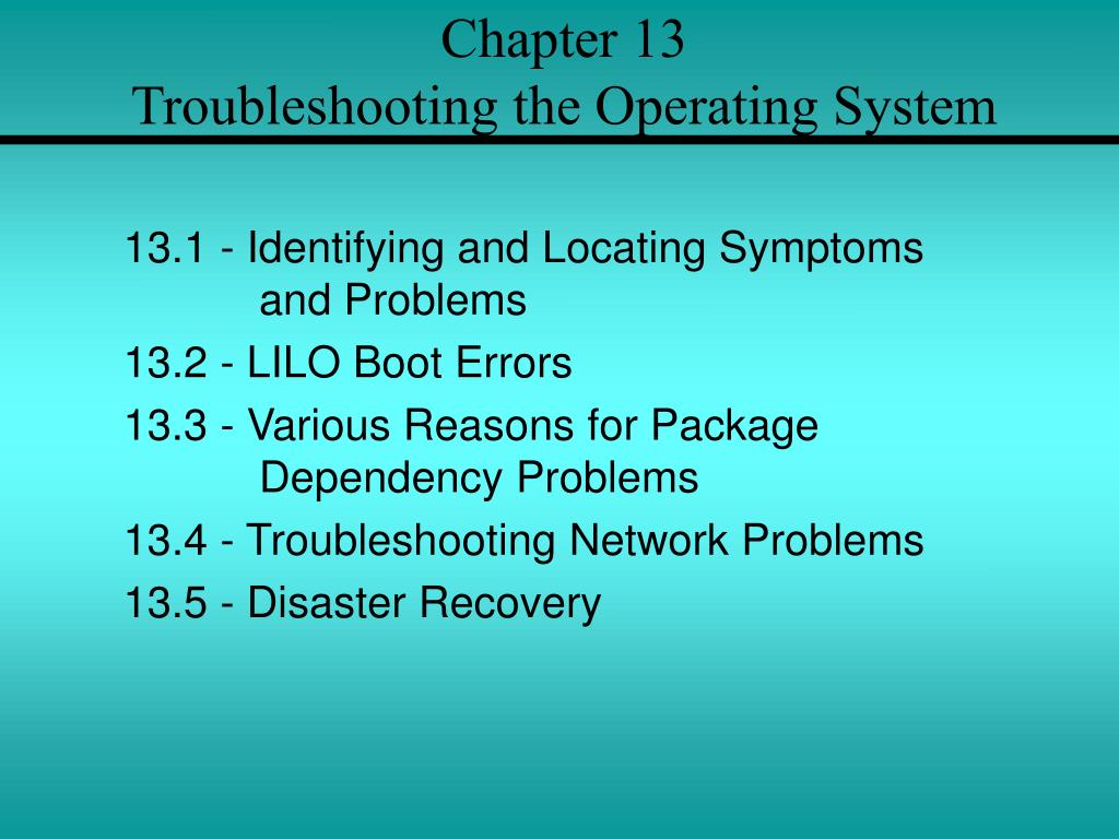 Chapter 13 Troubleshooting the Operating System . 13.1 - Identifying and Locating Symptoms and Problems 13.2 - LILO Boot Errors 13.3 - Various Reasons for Package Dependency Problems 13.4 - Troubleshooting Network Problems 13.5 - Disaster Recovery.