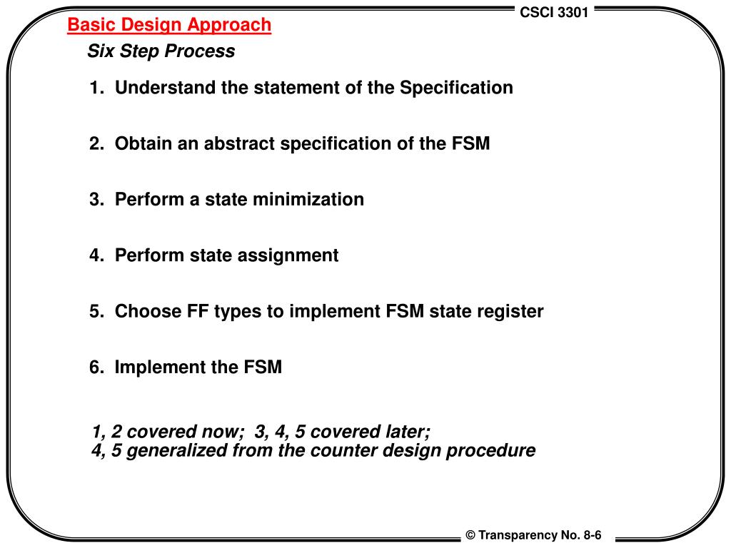 Basic Design Approach Six Step Process 1. Understand the statement of the Specification 2. Obtain an abstract specification of the FSM 3. Perform a state minimization 4. Perform state assignment 5. Choose FF types to implement FSM state register 6. Implement the FSM 1, 2 covered now; 3, 4, 5 covered later; 4, 5 generalized from the counter design procedure