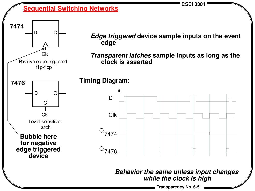 Sequential Switching Networks 7474 Edge triggered device sample inputs on the event edge Transparent latches sample inputs as long as the clock is asserted Timing Diagram: 7476 D Clk Q 7474 Bubble here for negative edge triggered device Q 7476 Behavior the same unless input changes while the clock is high