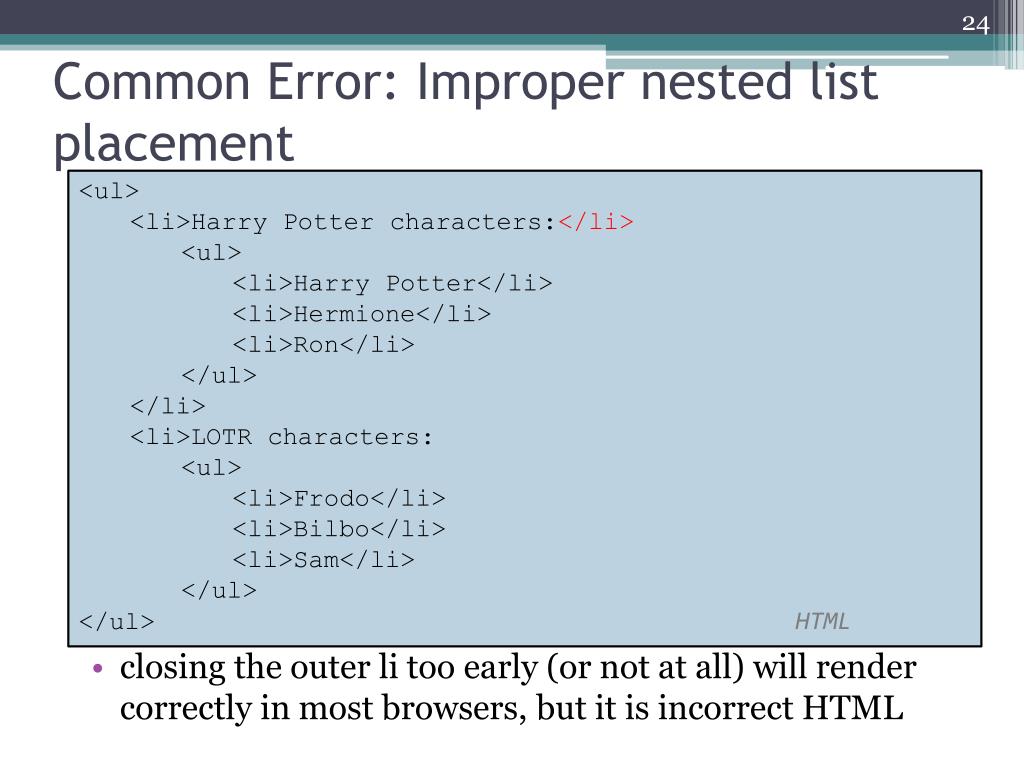 closing the outer li too early (or not at all) will render correctly in most browsers, but it is incorrect HTML Common Error: Improper nested list placement • <ul> • <li>Harry Potter characters:</li> • <ul> • <li>Harry Potter</li> • <li>Hermione</li> • <li>Ron</li> • </ul> • </li> • <li>LOTR characters: • <ul> • <li>Frodo</li> • <li>Bilbo</li> • <li>Sam</li> • </ul> • </ul>HTML