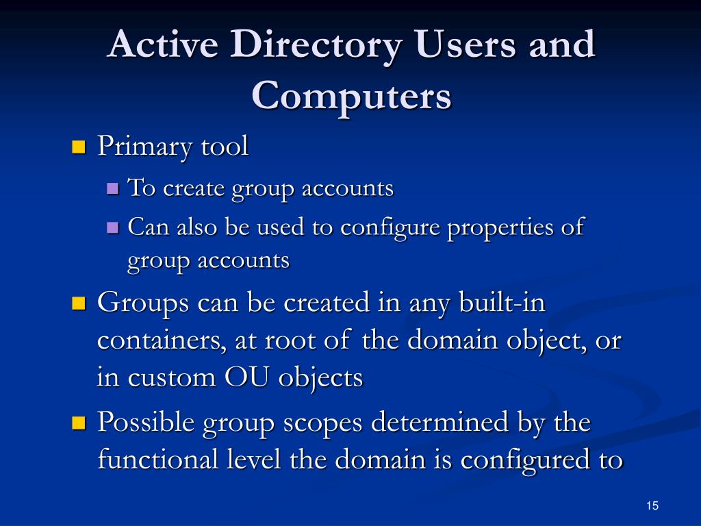 Active Directory Users and Computers • Primary tool • To create group accounts • Can also be used to configure properties of group accounts • Groups can be created in any built-in containers, at root of the domain object, or in custom OU objects • Possible group scopes determined by the functional level the domain is configured to