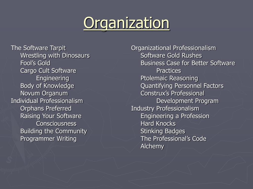 The Software Tarpit Wrestling with Dinosaurs Fool’s Gold Cargo Cult Software Engineering Body of Knowledge Novum Organum Individual Professionalism Orphans Preferred Raising Your Software Consciousness Building the Community Programmer Writing Organizational Professionalism Software Gold Rushes Business Case for Better Software Practices Ptolemaic Reasoning Quantifying Personnel Factors Construx’s Professional Development Program Industry Professionalism Engineering a Profession Hard Knocks Stinking Badges The Professional’s Code Alchemy Organization