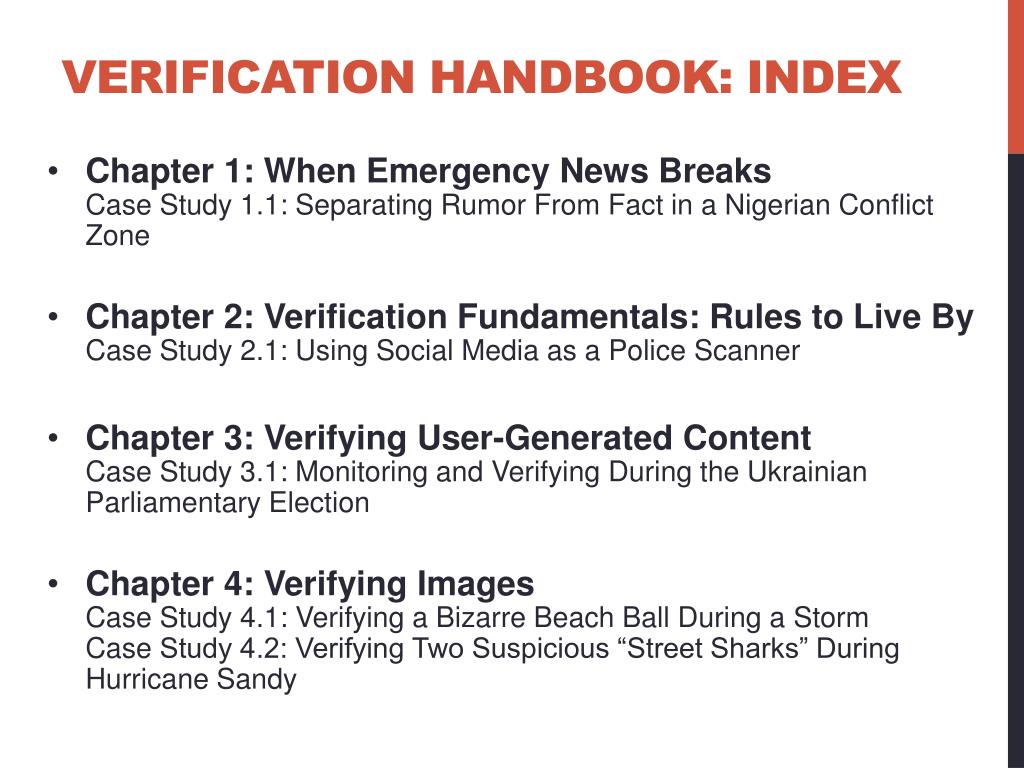 Verification Handbook: Index • Chapter 1: When Emergency News BreaksCase Study 1.1: Separating Rumor From Fact in a Nigerian Conflict Zone • Chapter 2: Verification Fundamentals: Rules to Live ByCase Study 2.1: Using Social Media as a Police Scanner • Chapter 3: Verifying User-Generated ContentCase Study 3.1: Monitoring and Verifying During the Ukrainian Parliamentary Election • Chapter 4: Verifying ImagesCase Study 4.1: Verifying a Bizarre Beach Ball During a StormCase Study 4.2: Verifying Two Suspicious “Street Sharks” During Hurricane Sandy