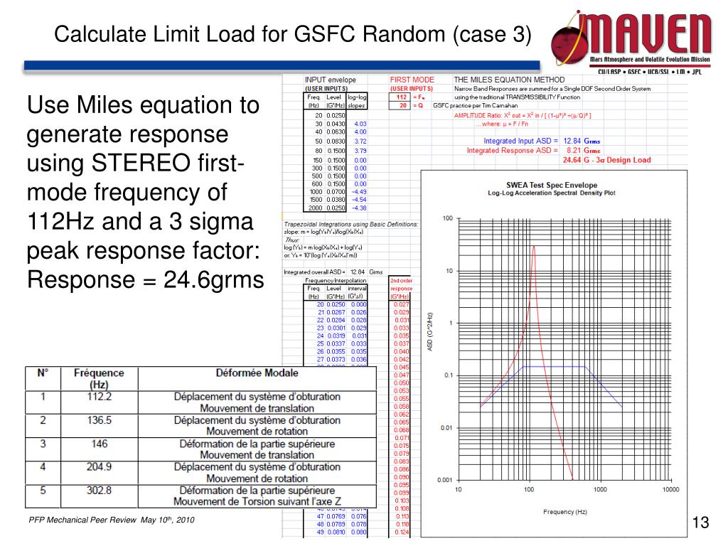 MAVEN Design loads • What alternate methods of analysis are acceptable? • LM practice: Design loads are to be calculated by Either: 1) Analyze using MAC loads + 1.5g SS load with the MAC SF if not testing, w/o if testing. Random vibe is considered an adequate test. Or: 2) Analyze to protoflight random levels (x 3 sigma) w/o SFs, or to acceptance levels (x 3 sigma) x random SFs. • GSFC practice for random (wants instead of 2 above): 3) Run Miles equation on protoflight random levels, x 3sigma x random SFs