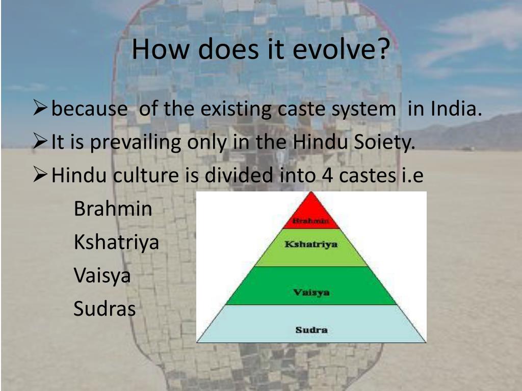 How does it evolve? • because of the existing caste system in India. • It is prevailing only in the Hindu Soiety. • Hindu culture is divided into 4 castes i.e Brahmin Kshatriya Vaisya Sudras