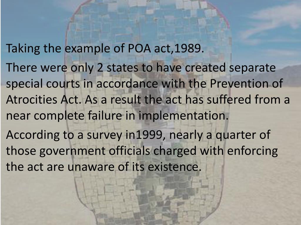 Taking the example of POA act,1989. There were only 2 states to have created separate special courts in accordance with the Prevention of Atrocities Act. As a result the act has suffered from a near complete failure in implementation. According to a survey in1999, nearly a quarter of those government officials charged with enforcing the act are unaware of its existence.