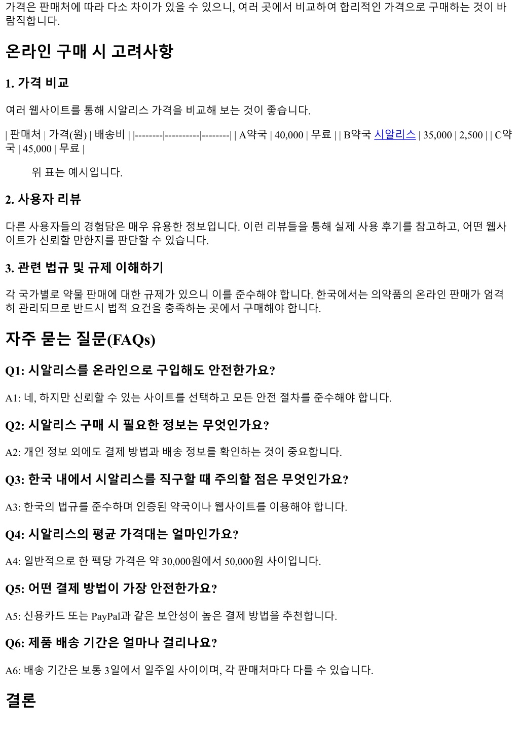 2. 가격은판매처에따라다소차이가있을수있으니, 여러곳에서비교하여합리적인가격으로구매하는것이바 람직합니다. 온라인구매시고려사항 1. 가격비교 여러웹사이트를통해시알리스가격을비교해보는것이좋습니다. | 판매처 | 가격(원) | 배송비 | |--------|----------|--------| | A약국 | 40,000 | 무료 | | B약국시알리스 | 35,000 | 2,500 | | C약 국 | 45,000 | 무료 | 위표는예시입니다. 2. 사용자리뷰 다른사용자들의경험담은매우유용한정보입니다. 이런리뷰들을통해실제사용후기를참고하고, 어떤웹사 이트가신뢰할만한지를판단할수있습니다. 3. 관련법규및규제이해하기 각국가별로약물판매에대한규제가있으니이를준수해야합니다. 한국에서는의약품의온라인판매가엄격 히관리되므로반드시법적요건을충족하는곳에서구매해야합니다. 자주묻는질문(FAQs) Q1: 시알리스를온라인으로구입해도안전한가요? A1: 네, 하지만신뢰할수있는사이트를선택하고모든안전절차를준수해야합니다. Q2: 시알리스구매시필요한정보는무엇인가요? A2: 개인정보외에도결제방법과배송정보를확인하는것이중요합니다. Q3: 한국내에서시알리스를직구할때주의할점은무엇인가요? A3: 한국의법규를준수하며인증된약국이나웹사이트를이용해야합니다. Q4: 시알리스의평균가격대는얼마인가요? A4: 일반적으로한팩당가격은약 30,000원에서 50,000원사이입니다. Q5: 어떤결제방법이가장안전한가요? A5: 신용카드또는 PayPal과같은보안성이높은결제방법을추천합니다. Q6: 제품배송기간은얼마나걸리나요? A6: 배송기간은보통 3일에서일주일사이이며, 각판매처마다다를수있습니다. 결론