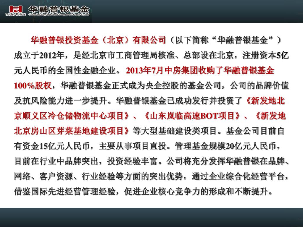 华融普银投资基金(北京)有限公司(以下简称“华融普银基金”)成立于2012年,是经北京市工商管理局核准、总部设在北京,注册资本5亿元人民币的全国性金融企业。 2013年7月中房集团收购了华融普银基金100%股权,华融普银基金正式成为央企控股的基金公司,公司的品牌价值及抗风险能力进一步提升。华融普银基金已成功发行并投资了《新发地北京顺义区冷仓储物流中心项目》、《山东岚临高速BOT项目》、《新发地北京房山区芽菜基地建设项目》等大型基础建设类项目。基金公司目前自有资金15亿元人民币,主要从事项目直投。管理基金规模20亿元人民币,目前在行业中品牌突出,投资经验丰富。公司将充分发挥华融普银在品牌、网络、客户资源、行业经验等方面的突出优势,通过企业综合化经营平台,借鉴国际先进经营管理经验,促进企业核心竞争力的形成和不断提升。
