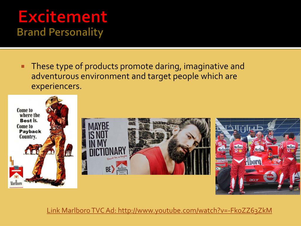 Excitement Brand Personality • These type of products promote daring, imaginative and adventurous environment and target people which are experiencers. Link Marlboro TVC Ad: http://www.youtube.com/watch?v=-FkoZZ63ZkM