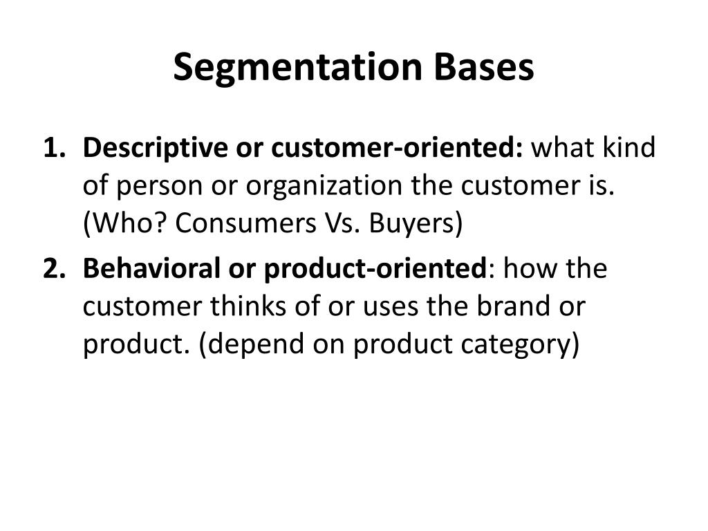 1. Descriptive or Consumer oriented Who? Consumers Vs. Buyers 1.1 Consumer Segmentation Bases 1.2 Business-to-business Segmentation Bases