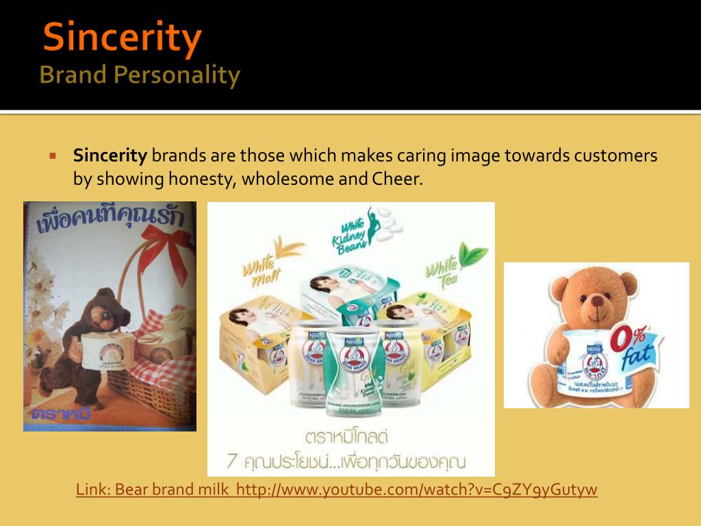 Sincerity Brand Personality • Sincerity brands are those which makes caring image towards customers by showing honesty, wholesome and Cheer. Link: Bear brand milk http://www.youtube.com/watch?v=C9ZY9yGutyw