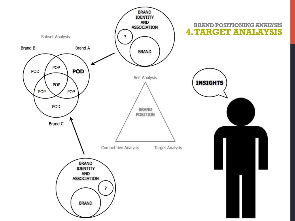 Brand Positioning Analysis3. Subset Analysis • Points of difference (PODs) refers to ‘attributes or benefits that consumers strongly associate with a brand, positively evaluate, and believe that they could not find to the same extent with a competitive brand’ (Barwise & Meehan as cited in Keller, 2008: 107) • ‘Points of parity (POPs) refers to ‘attributes or benefits that are not necessarily unique to the brand but may in fact be shared with other brands’ (Keller, 2008: 109).