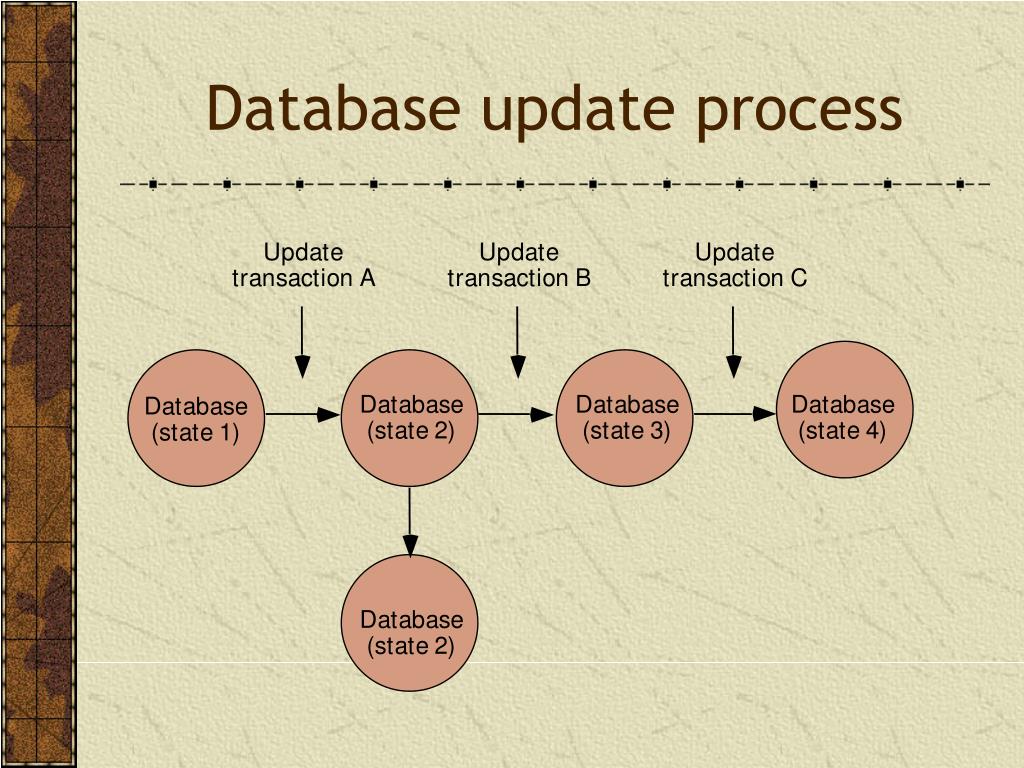 Database update process U p d a t e U p d a t e U p d a t e t r a n s a c t i o n A t r a n s a c t i o n B t r a n s a c t i o n C D a t a b a s e D a t a b a s e D a t a b a s e D a t a b a s e ( s t a t e 2 ) ( s t a t e 3 ) ( s t a t e 4 ) ( s t a t e 1 ) D a t a b a s e ( s t a t e 2 )