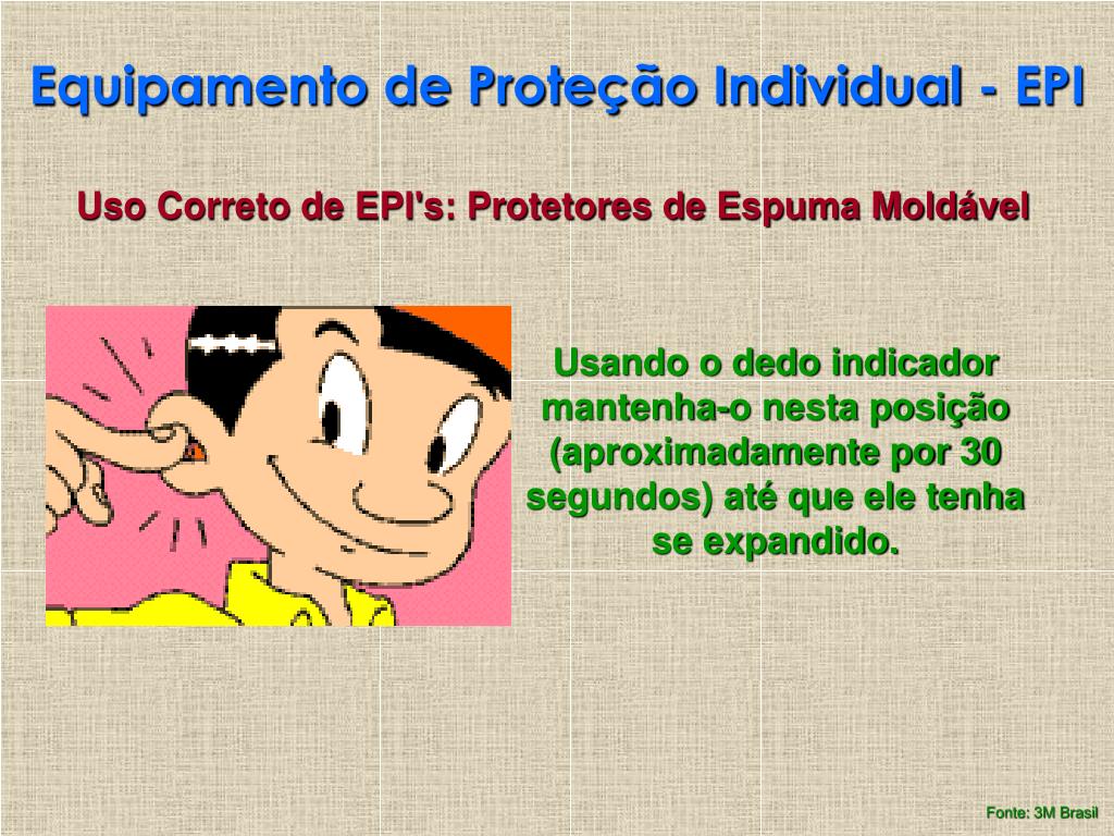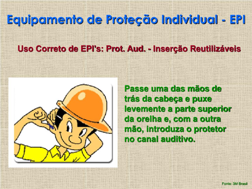 Equipamento de Proteção Individual - EPI Uso Correto de EPI's: Protetores de Espuma Moldável Para facilitar a colocação, puxe a orelha para cima e coloque o protetor no canal auditivo. Fonte: 3M Brasil