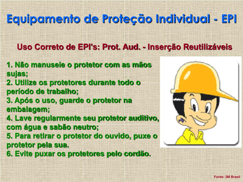 Equipamento de Proteção Individual - EPI Uso Correto de EPI's: Prot. Aud. - Inserção Reutilizáveis 1. Não manuseie o protetor com as mãos sujas; 2. Utilize os protetores durante todo o período de trabalho; 3. Após o uso, guarde o protetor na embalagem; 4. Lave regularmente seu protetor auditivo, com água e sabão neutro; 5. Para retirar o protetor do ouvido, puxe o protetor pela sua. 6. Evite puxar os protetores pelo cordão. Fonte: 3M Brasil