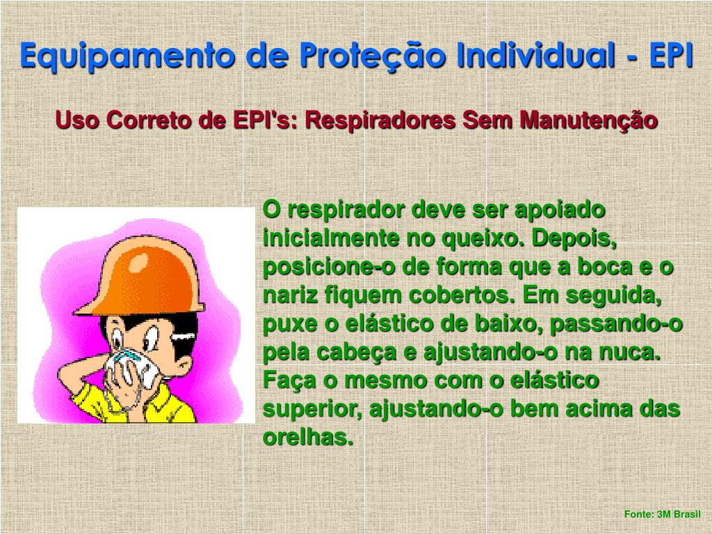 Equipamento de Proteção Individual - EPI Uso Correto de EPI's: Respiradores Sem Manutenção O respirador deve ser apoiado inicialmente no queixo. Depois, posicione-o de forma que a boca e o nariz fiquem cobertos. Em seguida, puxe o elástico de baixo, passando-o pela cabeça e ajustando-o na nuca. Faça o mesmo com o elástico superior, ajustando-o bem acima das orelhas. Fonte: 3M Brasil