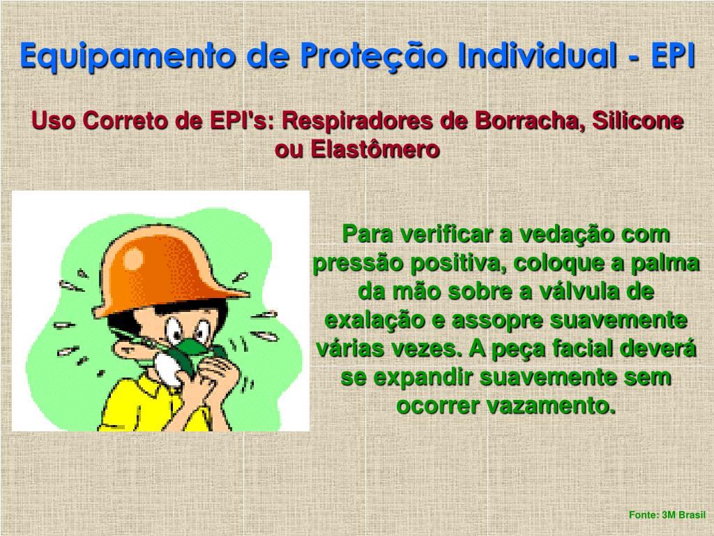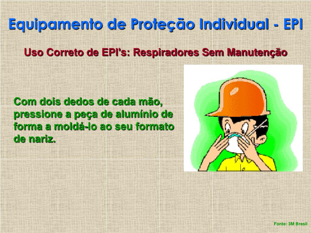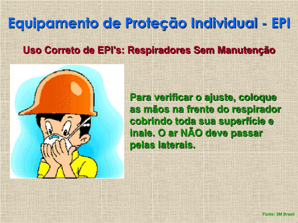 Equipamento de Proteção Individual - EPI Uso Correto de EPI's: Respiradores Sem Manutenção Para verificar o ajuste, coloque as mãos na frente do respirador cobrindo toda sua superfície e inale. O ar NÃO deve passar pelas laterais. Fonte: 3M Brasil