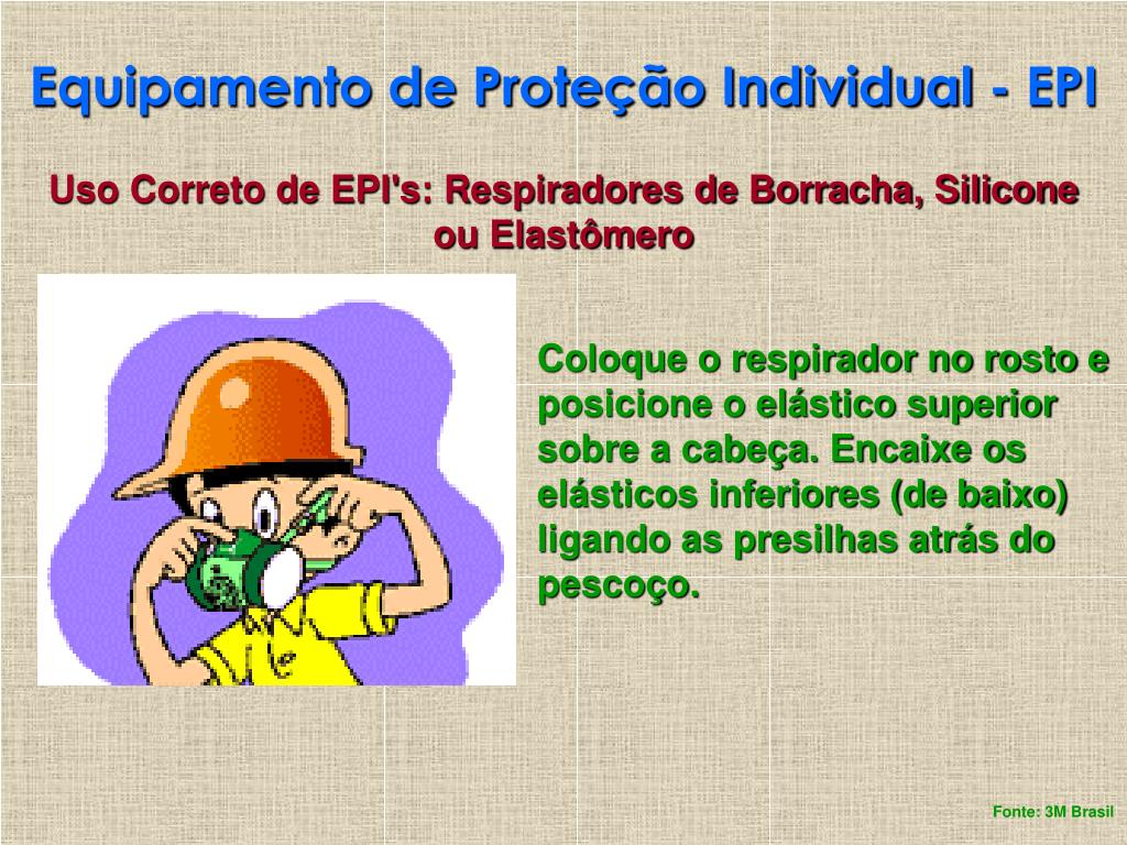Equipamento de Proteção Individual - EPI Uso Correto de EPI's: Respiradores de Borracha, Silicone ou Elastômero Coloque o respirador no rosto e posicione o elástico superior sobre a cabeça. Encaixe os elásticos inferiores (de baixo) ligando as presilhas atrás do pescoço. Fonte: 3M Brasil