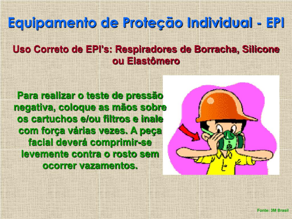 Equipamento de Proteção Individual - EPI Uso Correto de EPI's: Respiradores de Borracha, Silicone ou Elastômero Para realizar o teste de pressão negativa, coloque as mãos sobre os cartuchos e/ou filtros e inale com força várias vezes. A peça facial deverá comprimir-se levemente contra o rosto sem ocorrer vazamentos. Fonte: 3M Brasil