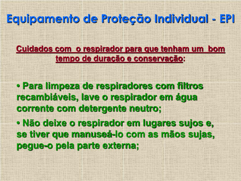 Equipamento de Proteção Individual - EPI Cuidados com o respirador para que tenham um bom tempo de duração e conservação: • Para limpeza de respiradores com filtros recambiáveis, lave o respirador em água corrente com detergente neutro; • Não deixe o respirador em lugares sujos e, se tiver que manuseá-lo com as mãos sujas, pegue-o pela parte externa;