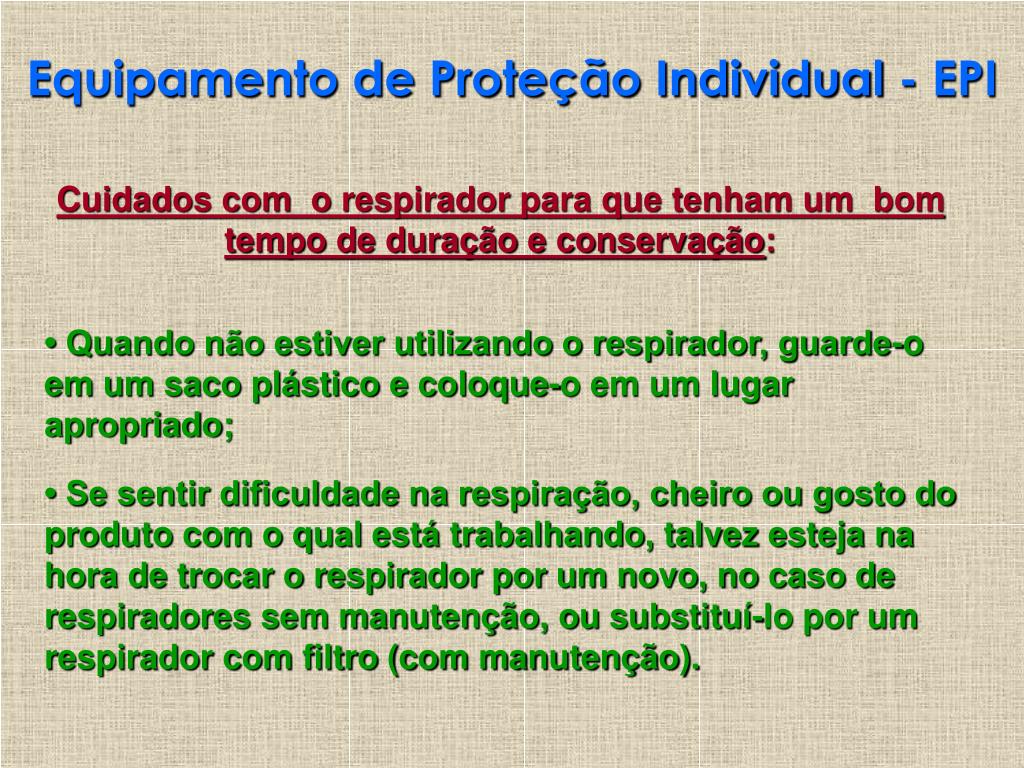 Equipamento de Proteção Individual - EPI Cuidados com o respirador para que tenham um bom tempo de duração e conservação: • Quando não estiver utilizando o respirador, guarde-o em um saco plástico e coloque-o em um lugar apropriado; • Se sentir dificuldade na respiração, cheiro ou gosto do produto com o qual está trabalhando, talvez esteja na hora de trocar o respirador por um novo, no caso de respiradores sem manutenção, ou substituí-lo por um respirador com filtro (com manutenção).