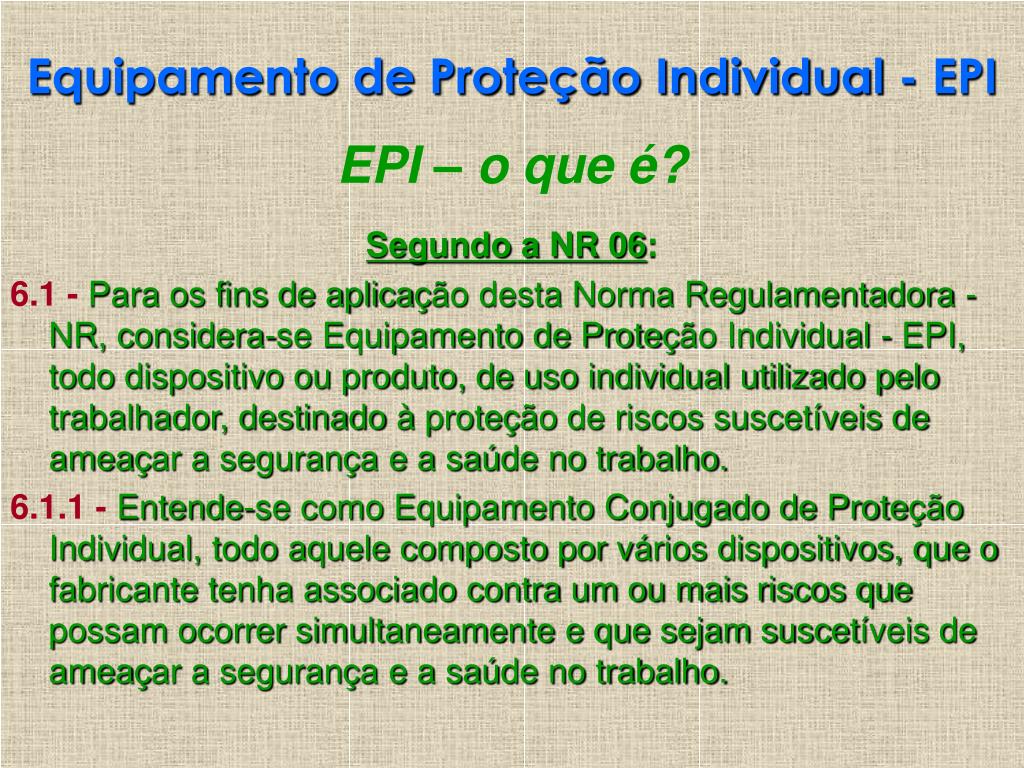 Equipamento de Proteção Individual - EPI EPI – o que é? Segundo a NR 06: 6.1 -Para os fins de aplicação desta Norma Regulamentadora - NR, considera-se Equipamento de Proteção Individual - EPI, todo dispositivo ou produto, de uso individual utilizado pelo trabalhador, destinado à proteção de riscos suscetíveis de ameaçar a segurança e a saúde no trabalho. 6.1.1 - Entende-se como Equipamento Conjugado de Proteção Individual, todo aquele composto por vários dispositivos, que o fabricante tenha associado contra um ou mais riscos que possam ocorrer simultaneamente e que sejam suscetíveis de ameaçar a segurança e a saúde no trabalho.