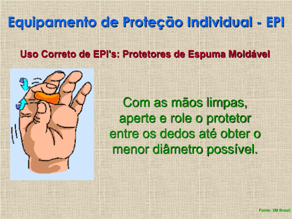 Equipamento de Proteção Individual - EPI Uso Correto de EPI's: Protetores de Espuma Moldável Com as mãos limpas, aperte e role o protetor entre os dedos até obter o menor diâmetro possível. Fonte: 3M Brasil