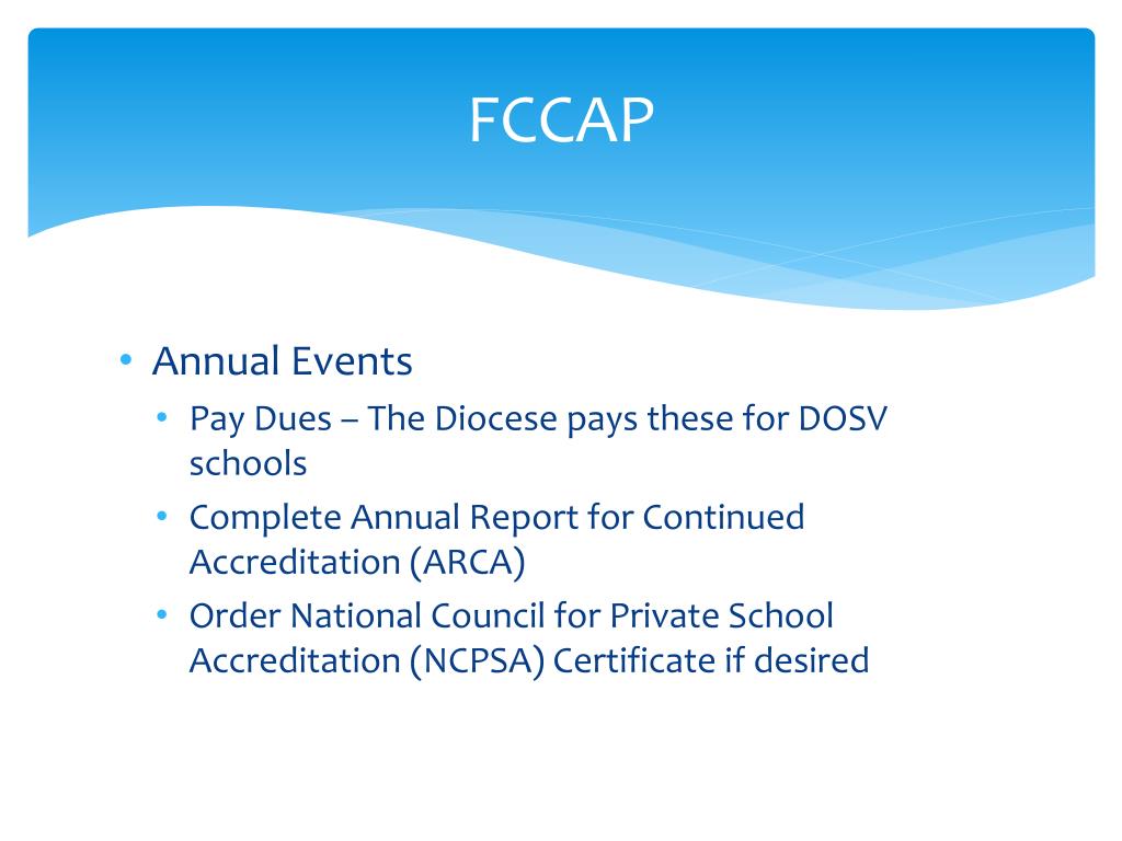 FCCAP • Annual Events • Pay Dues – The Diocese pays these for DOSV schools • Complete Annual Report for Continued Accreditation (ARCA) • Order National Council for Private School Accreditation (NCPSA) Certificate if desired