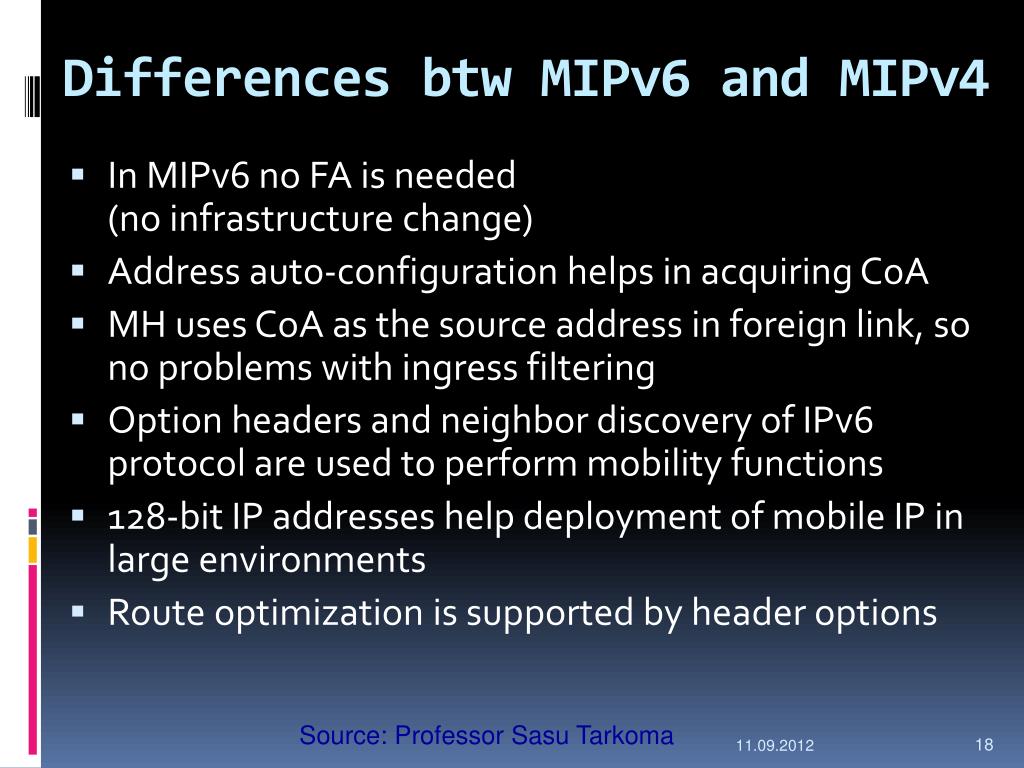 Differences btw MIPv6 and MIPv4 • In MIPv6 no FA is needed (no infrastructure change) • Address auto-configuration helps in acquiring CoA • MH uses CoA as the source address in foreign link, so no problems with ingress filtering • Option headers and neighbor discovery of IPv6 protocol are used to perform mobility functions • 128-bit IP addresses help deployment of mobile IP in large environments • Route optimization is supported by header options • Source: Professor Sasu Tarkoma