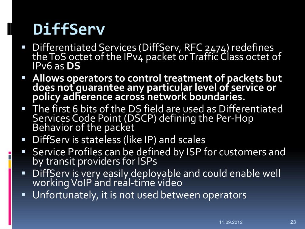 DiffServ • Differentiated Services (DiffServ, RFC 2474) redefines the ToS octet of the IPv4 packet or Traffic Class octet of IPv6 as DS • Allows operators to control treatment of packets but does not guarantee any particular level of service or policy adherence across network boundaries. • The first 6 bits of the DS field are used as Differentiated Services Code Point (DSCP) defining the Per-Hop Behavior of the packet • DiffServ is stateless (like IP) and scales • Service Profiles can be defined by ISP for customers and by transit providers for ISPs • DiffServ is very easily deployable and could enable well working VoIP and real-time video • Unfortunately, it is not used between operators