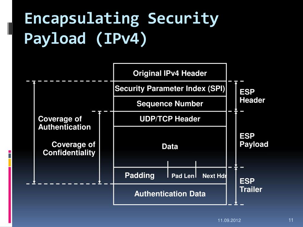 Original IPv4 Header Security Parameter Index (SPI) ESP Header Sequence Number Coverage of Authentication UDP/TCP Header ESP Payload Coverage ofConfidentiality Data Padding Pad Len Next Hdr ESP Trailer Authentication Data Encapsulating Security Payload (IPv4)