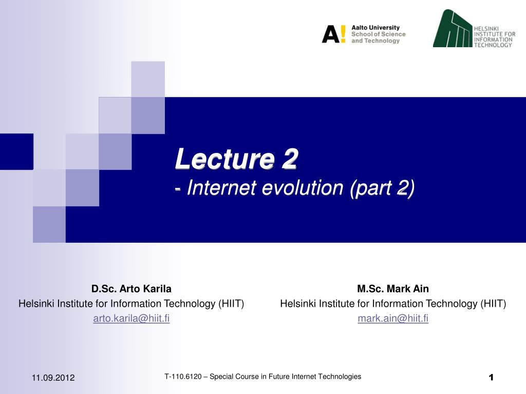 Lecture 2 - Internet evolution (part 2). D.Sc. Arto Karila Helsinki Institute for Information Technology (HIIT) arto.karila@hiit.fi. M.Sc. Mark Ain Helsinki Institute for Information Technology (HIIT) mark.ain@hiit.fi. T-110.6120 – Special Course in Future Internet Technologies.