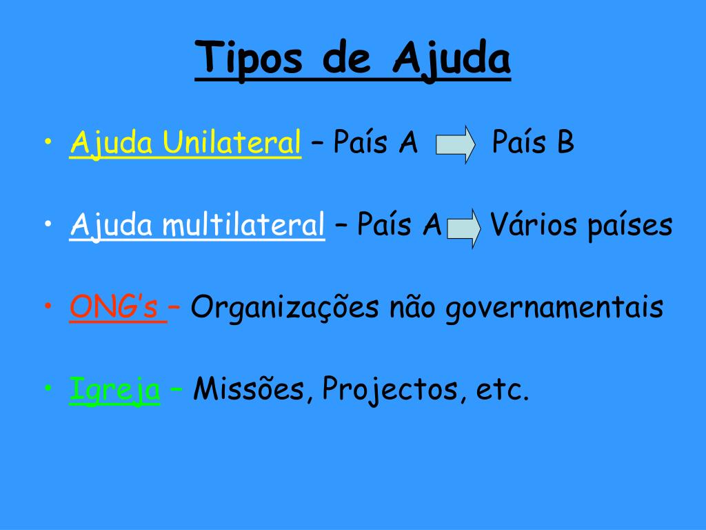 Tipos de Ajuda • Ajuda Unilateral – País A País B • Ajuda multilateral – País A Vários países • ONG’s – Organizações não governamentais • Igreja – Missões, Projectos, etc.