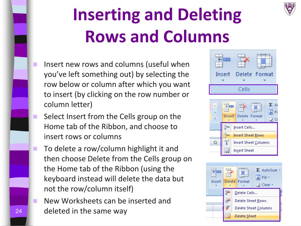 Inserting and Deleting Rows and Columns • Insert new rows and columns (useful when you’ve left something out) by selecting the row below or column after which you want to insert (by clicking on the row number or column letter) • Select Insert from the Cells group on the Home tab of the Ribbon, and choose to insert rows or columns • To delete a row/column highlight it and then choose Delete from the Cells group on the Home tab of the Ribbon (using the keyboard instead will delete the data but not the row/column itself) • New Worksheets can be inserted and deleted in the same way