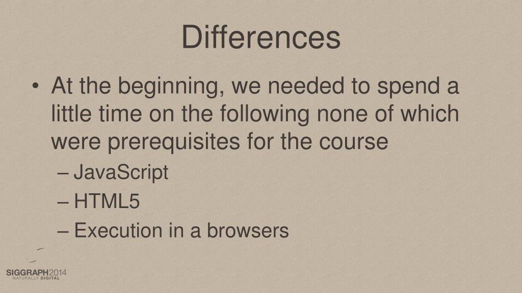 Differences • At the beginning, we needed to spend a little time on the following none of which were prerequisites for the course • JavaScript • HTML5 • Execution in a browsers