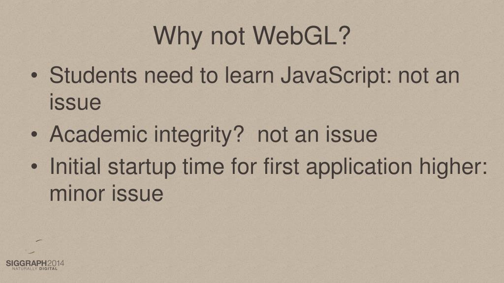 Why not WebGL? • Students need to learn JavaScript: not an issue • Academic integrity? not an issue • Initial startup time for first application higher: minor issue
