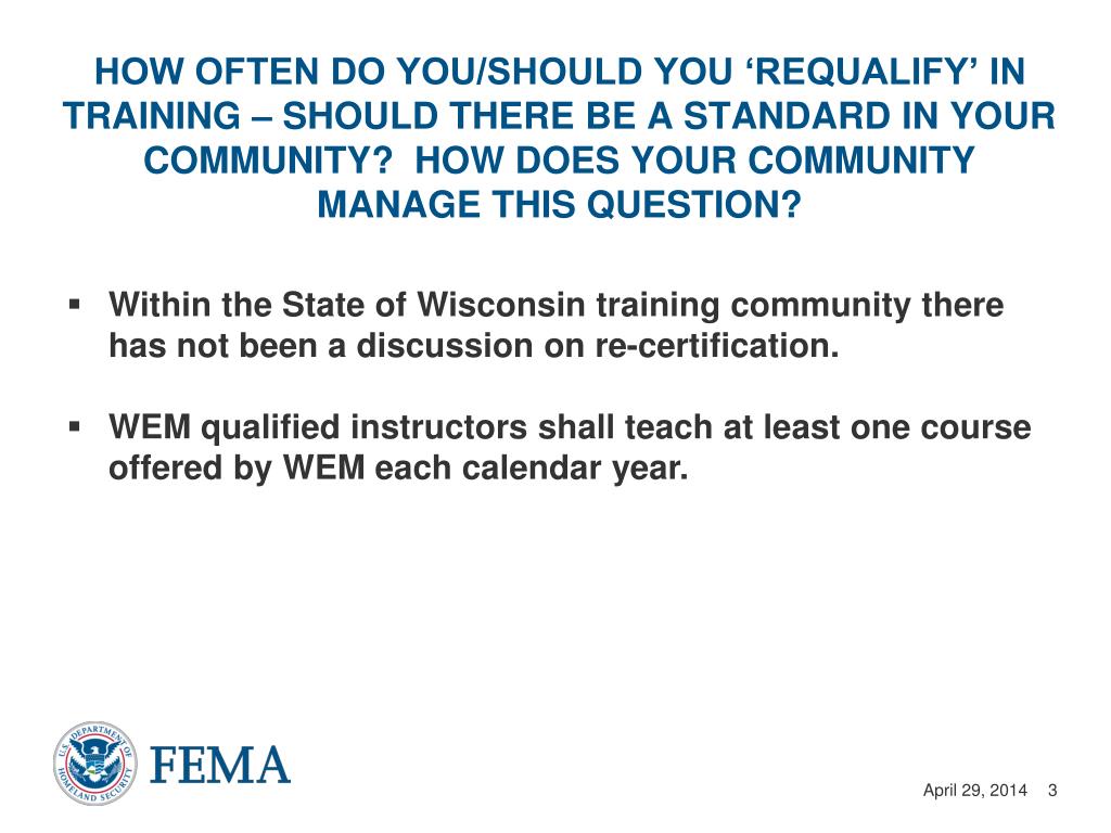 Within the State of Wisconsin training community there has not been a discussion on re-certification. WEM qualified instructors shall teach at least one course offered by WEM each calendar year. How often do you/should you ‘requalify’ in training – Should there be a standard in your community? How does your community manage this question?
