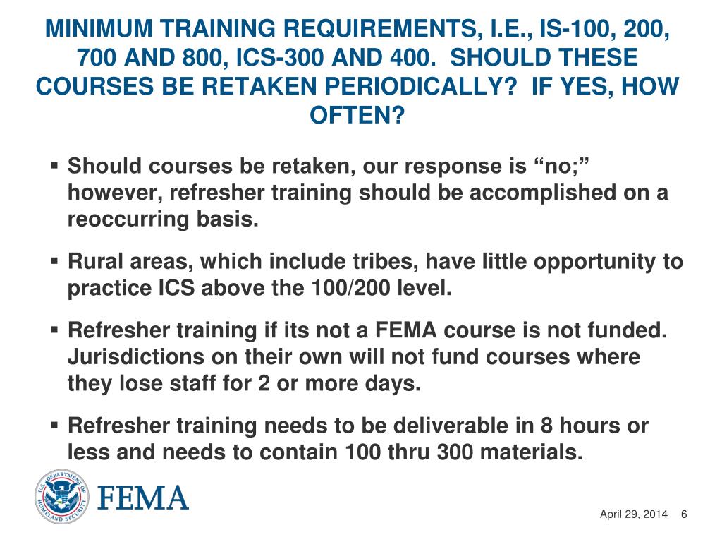 Minimum training requirements, i.e., IS-100, 200, 700 and 800, ICS-300 and 400. Should these courses be retaken periodically? If yes, how often? • Should courses be retaken, our response is “no;” however, refresher training should be accomplished on a reoccurring basis. • Rural areas, which include tribes, have little opportunity to practice ICS above the 100/200 level. • Refresher training if its not a FEMA course is not funded. Jurisdictions on their own will not fund courses where they lose staff for 2 or more days. • Refresher training needs to be deliverable in 8 hours or less and needs to contain 100 thru 300 materials.