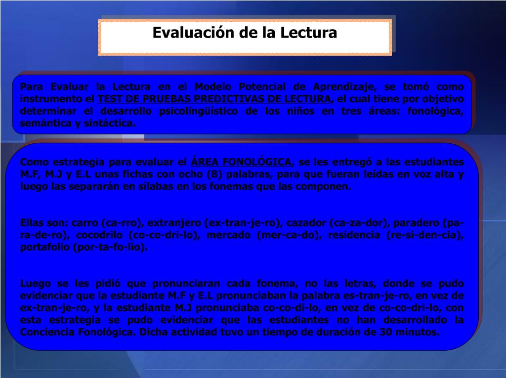 Evaluación de la Lectura Para Evaluar la Lectura en el Modelo Potencial de Aprendizaje, se tomó como instrumento el TEST DE PRUEBAS PREDICTIVAS DE LECTURA, el cual tiene por objetivo determinar el desarrollo psicolingüístico de los niños en tres áreas: fonológica, semántica y sintáctica. Como estrategia para evaluar el ÁREA FONOLÓGICA, se les entregó a las estudiantes M.F, M.J y E.L unas fichas con ocho (8) palabras, para que fueran leídas en voz alta y luego las separarán en sílabas en los fonemas que las componen. Ellas son: carro (ca-rro), extranjero (ex-tran-je-ro), cazador (ca-za-dor), paradero (pa-ra-de-ro), cocodrilo (co-co-dri-lo), mercado (mer-ca-do), residencia (re-si-den-cia), portafolio (por-ta-fo-lio). Luego se les pidió que pronunciaran cada fonema, no las letras, donde se pudo evidenciar que la estudiante M.F y E.L pronunciaban la palabra es-tran-je-ro, en vez de ex-tran-je-ro, y la estudiante M.J pronunciaba co-co-di-lo, en vez de co-co-dri-lo, con esta estrategia se pudo evidenciar que las estudiantes no han desarrollado la Conciencia Fonológica. Dicha actividad tuvo un tiempo de duración de 30 minutos.