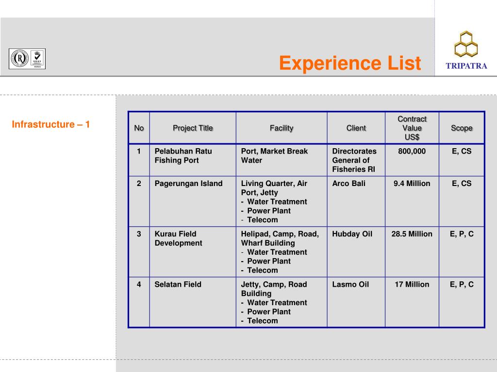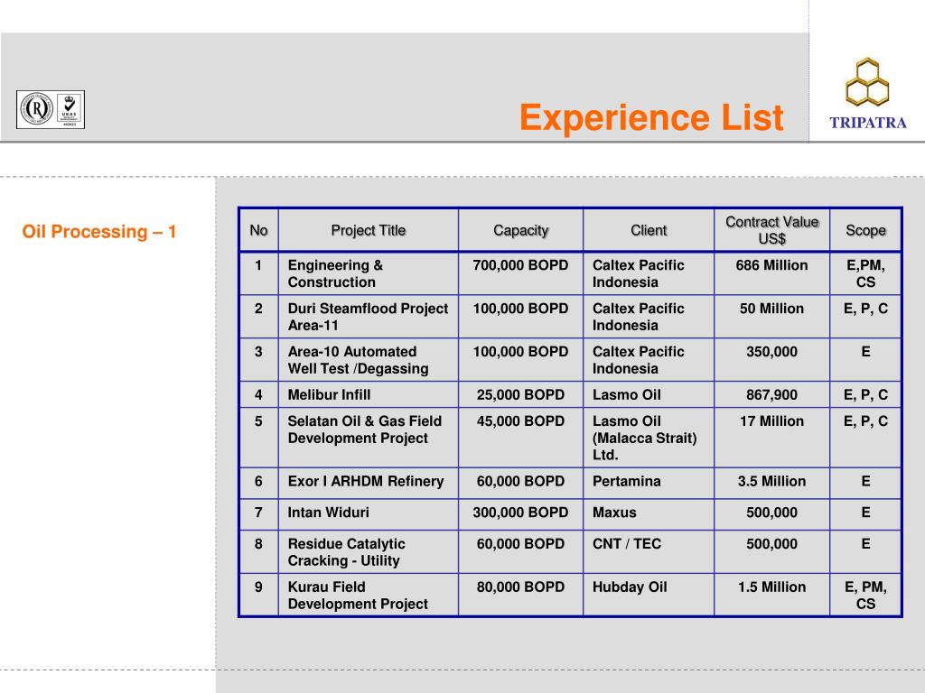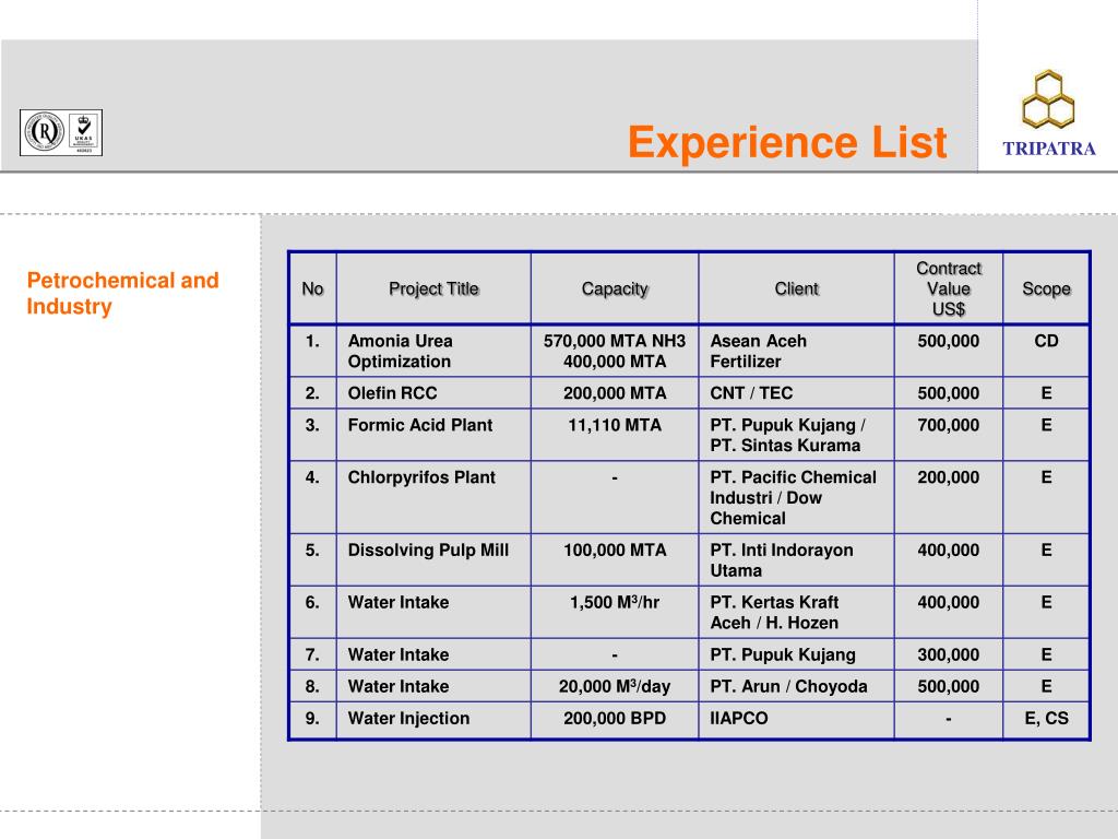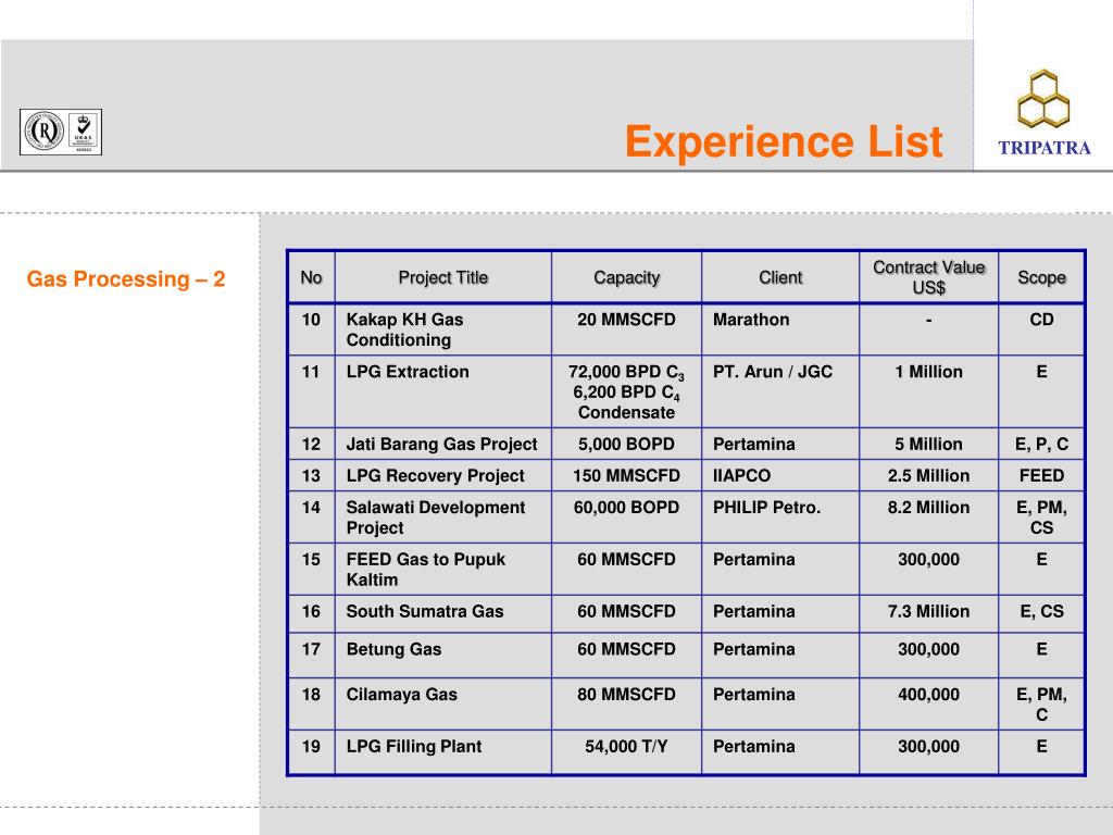 Tripatra Group of Companies PT. TRIPATRA ENGINEERING Incorporated in 1973 to pioneer the development of engineering, procurement, construction supervision and project management consulting services to the Oil & Gas Industry in Indonesia. PT. TRIPATRA ENGINEERS AND CONSTRUCTORS Incorporated in 1988 in response to the rising demand from project owners for an Indonesian company to pioneer the challenge of EPC turnkey projects including operations and maintenance.