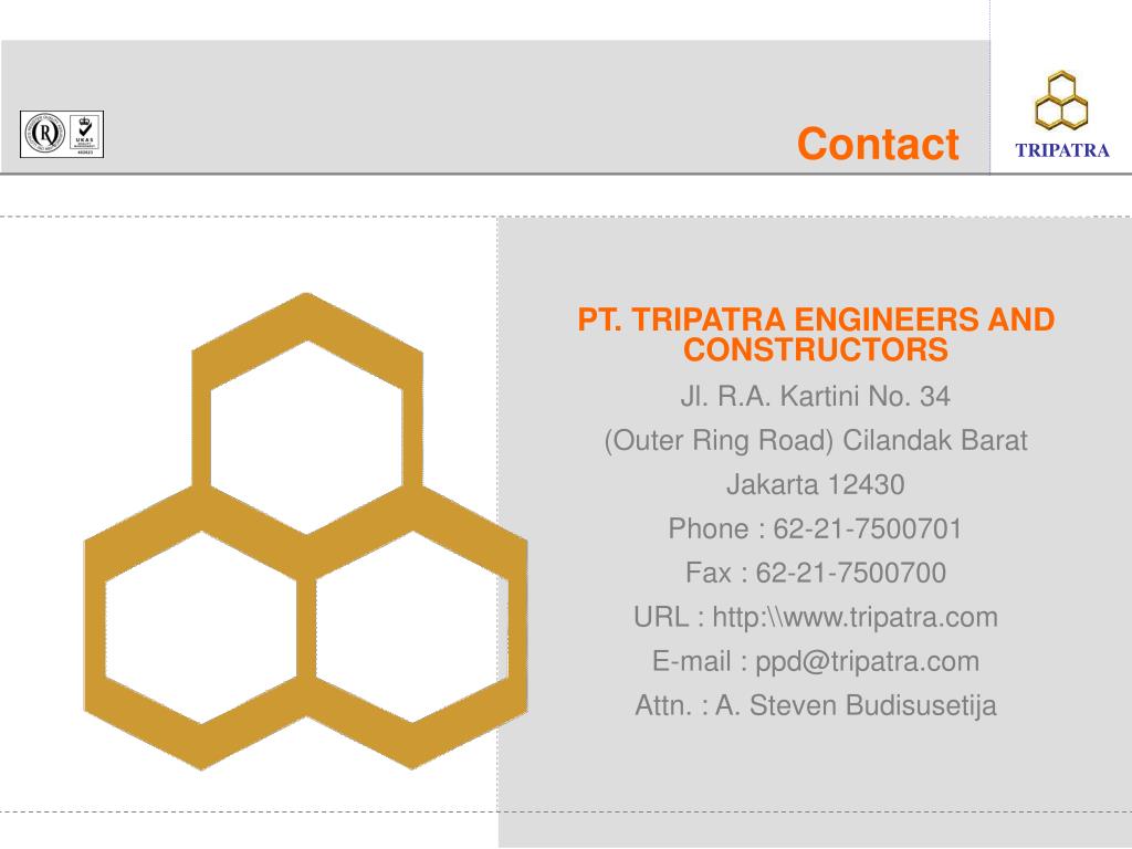 Contact Gas Processing & LPG Oil Processing & Refinery Petrochemical & Industry Marine Facilities & Offshore Platforms Power Generation Telecommunication PT. TRIPATRA ENGINEERS AND CONSTRUCTORS Jl. R.A. Kartini No. 34 (Outer Ring Road) Cilandak Barat Jakarta 12430 Phone : 62-21-7500701 Fax : 62-21-7500700 URL : http:\\www.tripatra.com E-mail : ppd@tripatra.com Attn. : A. Steven Budisusetija