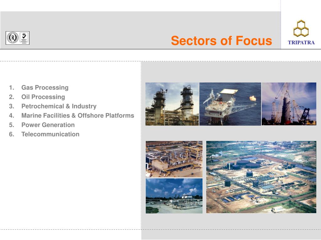 Sectors of Focus 1. 2. 3. 4. 5. 6. Gas Processing Oil Processing Petrochemical & Industry Marine Facilities & Offshore Platforms Power Generation Telecommunication